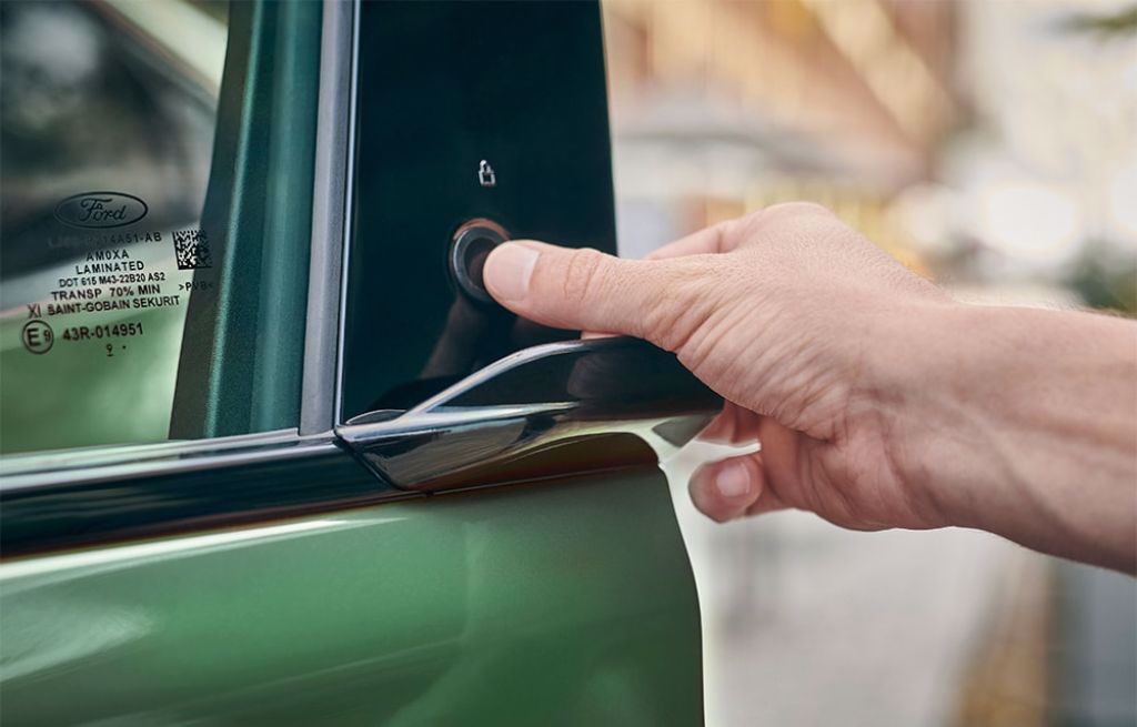 Strømlinjet design. Ingen flere dørhåndtak. Idet du nærmer deg, gjenkjenner Mustang Mach-E nøkkelen og lyser opp en dørknapp som du simpelthen trykker på for å åpne.